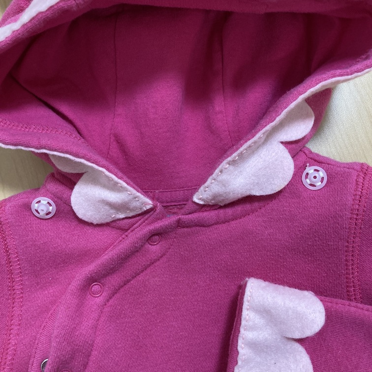 ロンパースの首元にボタンを縫い付けて、よだれかけを装着できるようにします。